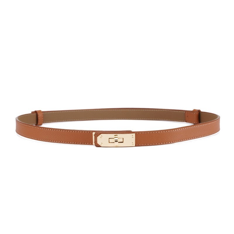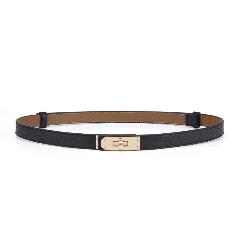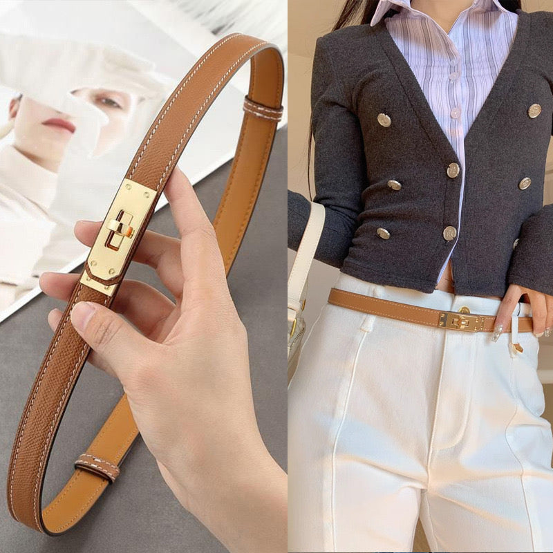 Cintura da donna dallo stile minimal chic, realizzata in vera pelle di alta qualità e rifinita con una raffinata chiusura rotante in metallo dorato, dettaglio iconico che dona eleganza e modernità al design.