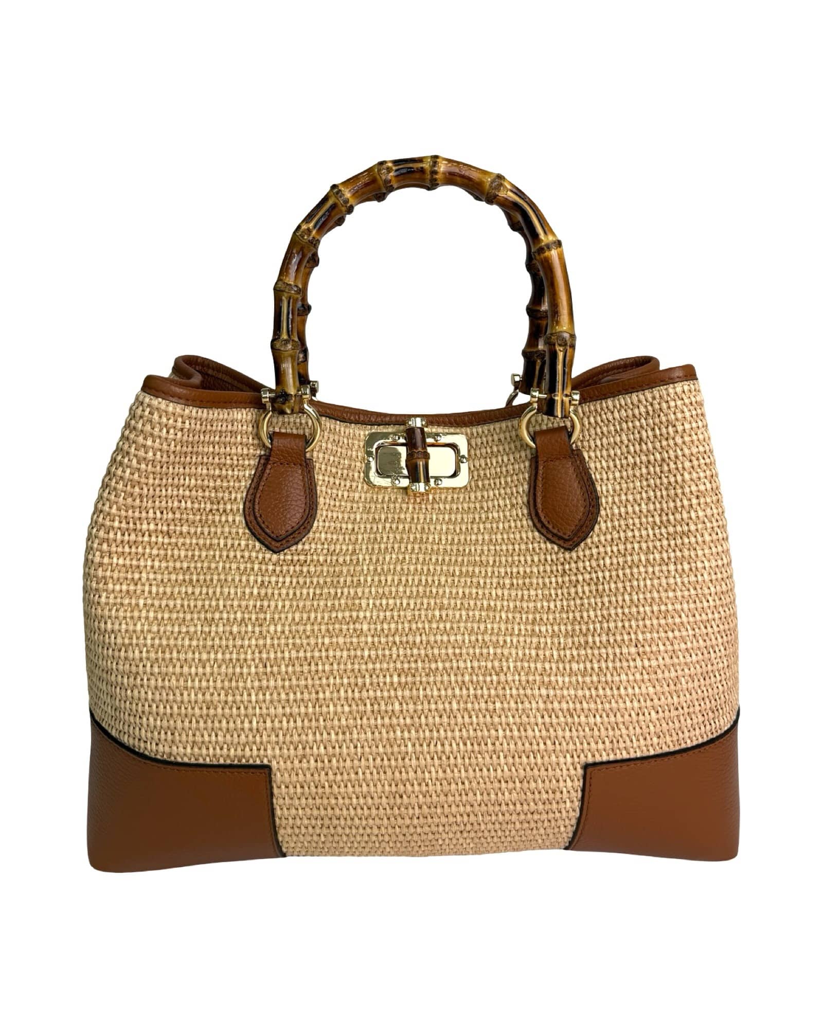 Questa borsa, realizzata interamente in Italia, combina design sofisticato e funzionalità, grazie ai manici rigidi in bambù, la tracolla regolabile in pelle e gli interni ben organizzati.
