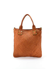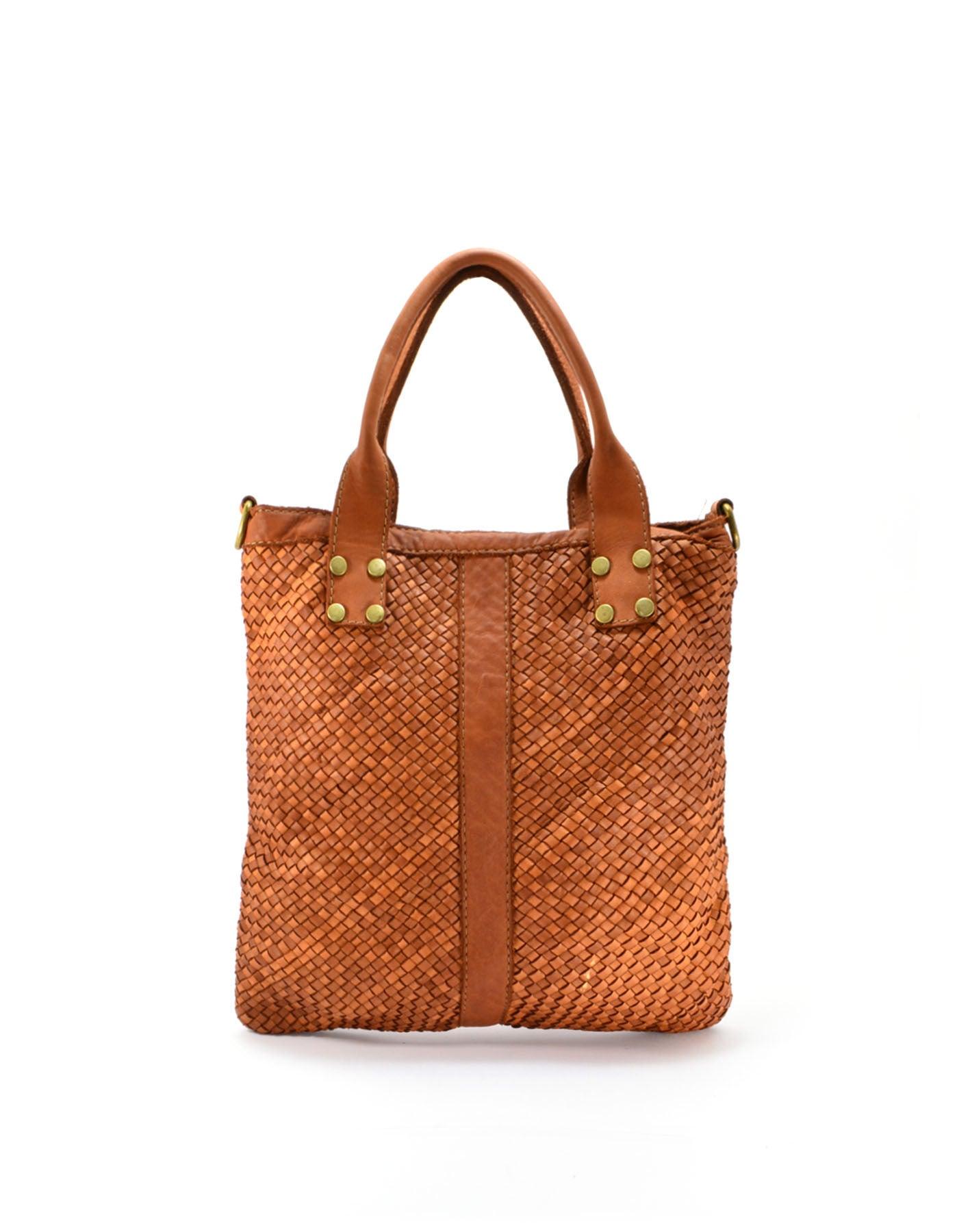 Stupenda borsa a spalla vintage in pelle intrecciata di vitello lavato e tinto in capo. La borsa è dotata di doppio manico e tracolla lunga, con chiusura a cerniera. All'interno presenta una tasca portacellulare e una tasca con chiusura a cerniera. Accessori in oro invecchiato.