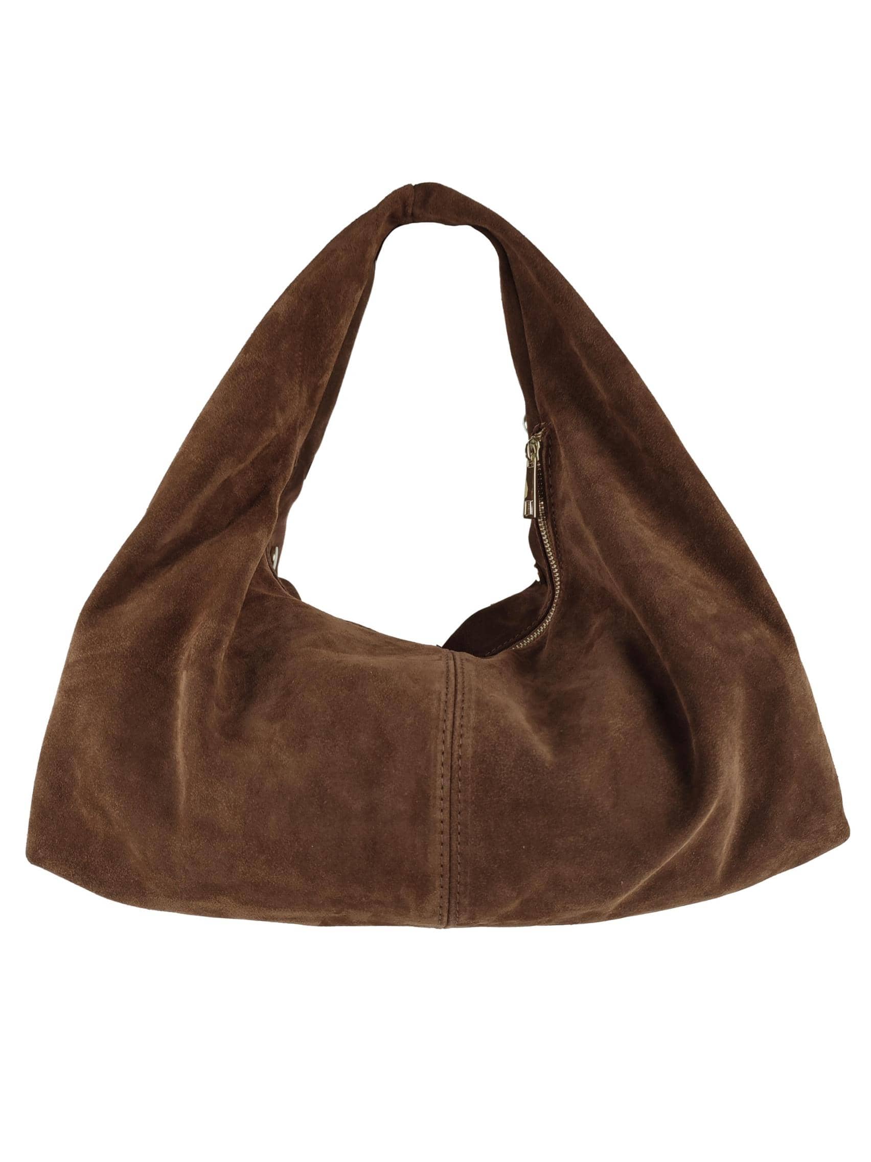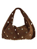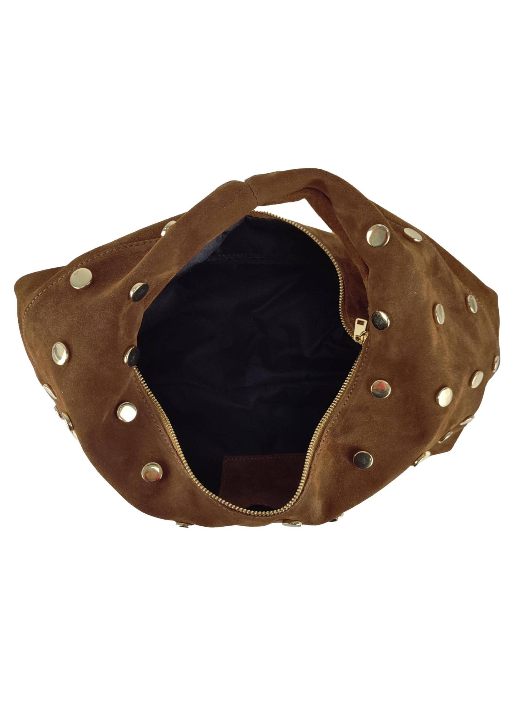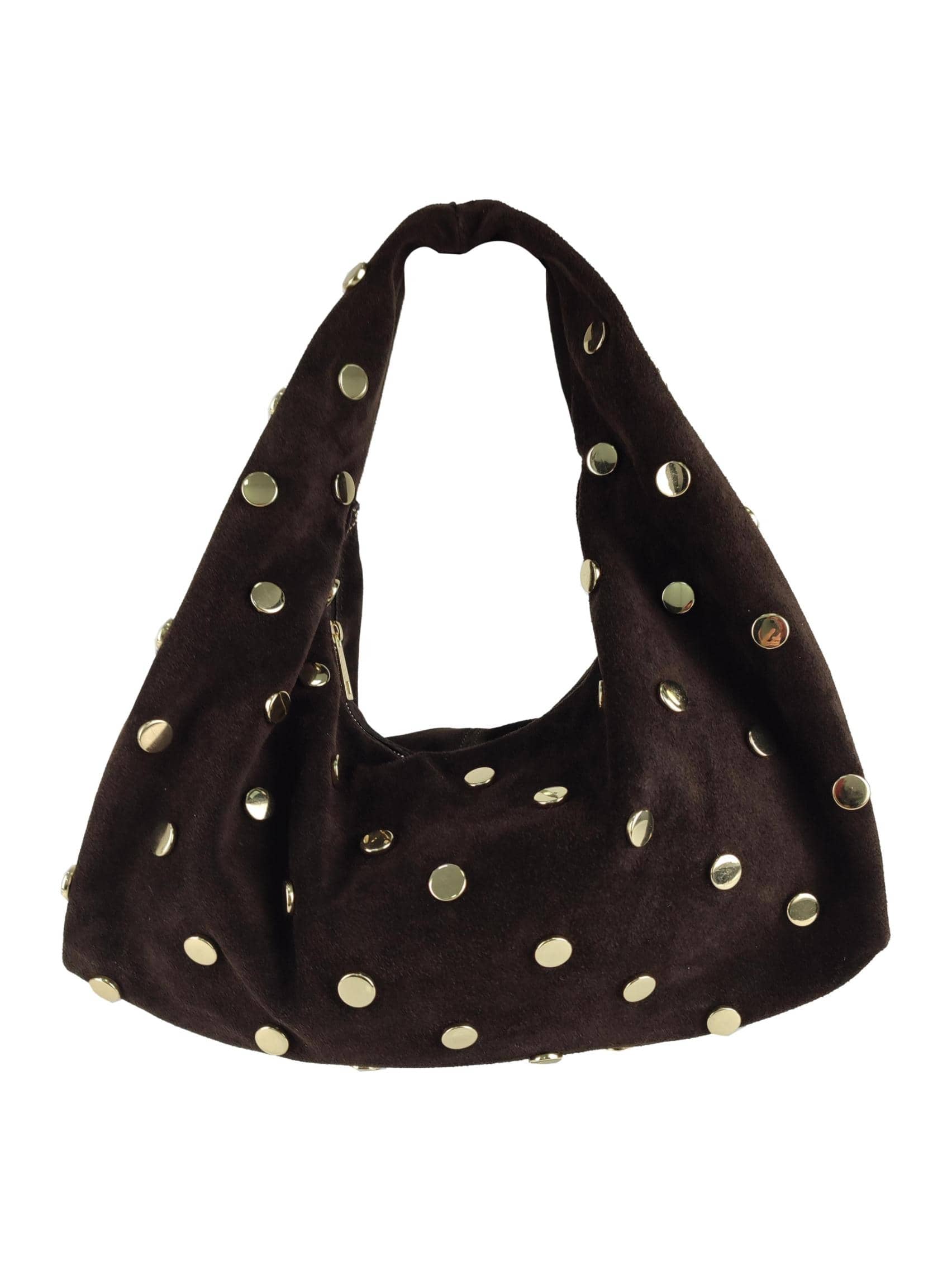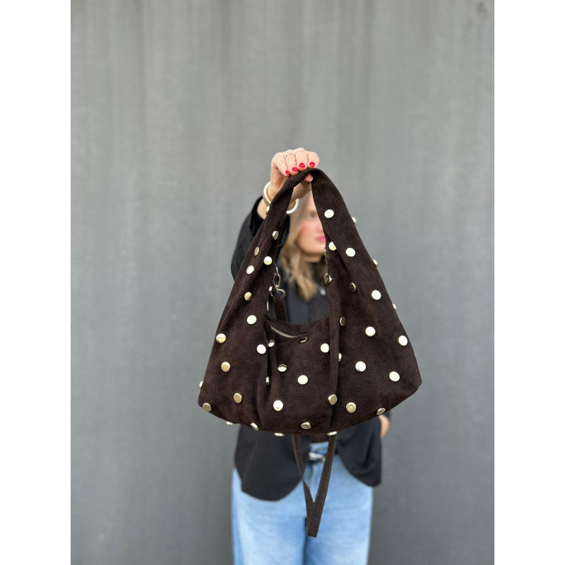 Lasciati conquistare dal fascino sofisticato della borsa hobo in suede con borchie rotonde dorate, un accessorio intramontabile che unisce artigianalità italiana e stile contemporaneo.